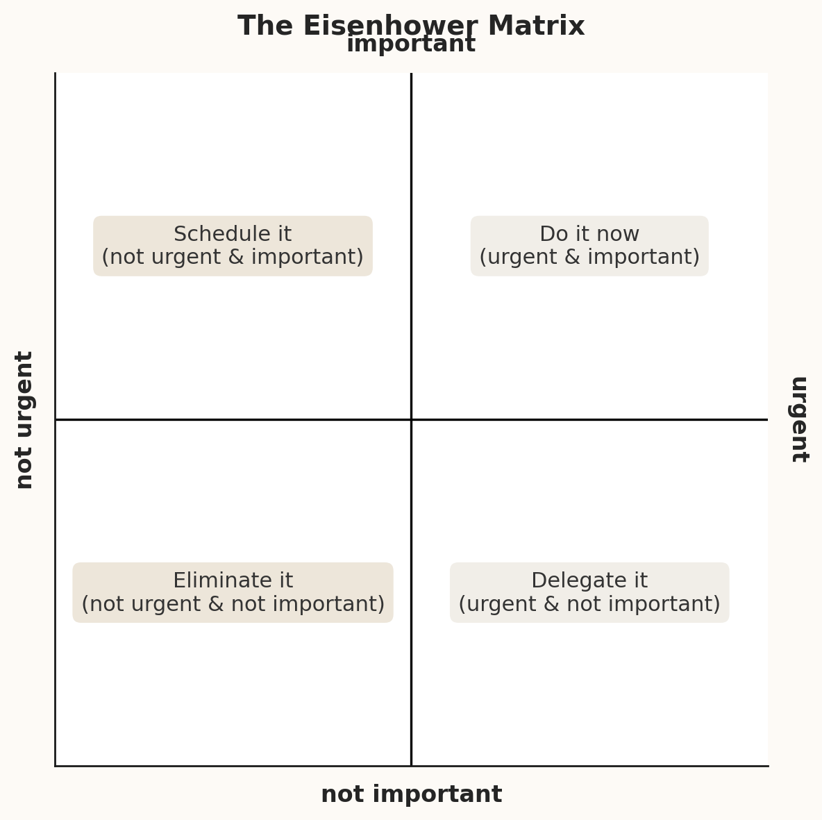 Dwight D. Eisenhower, the 34th president of the United States and a five-star general, once said, “What is important is seldom urgent, and what is urgent is seldom important.” From this simple insight comes one of the most enduring productivity frameworks: the Eisenhower Matrix. It’s a grid that helps you separate the noise from the signal, making it clearer which tasks to do, delegate, schedule, or drop.